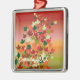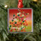 Uma formação solta de folhas de Maple multicoloridas cai suavemente contra o pano de fundo de um pôr do sol vívido canadense num ornamento com fita vermelha coordenadora.