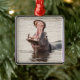 ornamento cerâmico com imagem de hipopótamo boiando com boca aberta enquanto na água.