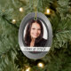 Um lado desse ornamento de manutenção apresenta sua fotografia de formando enquadrada em uma atraente cinza de aço com aparência metálica, que é complementar à maioria dos retratos. Um banner branco na parte inferior contém seu texto facilmente personalizado. O outro lado é a cinza de prata. Se você quiser adicionar texto, poderá fazer isso escolhendo "Personalizar". **Por favor, note — a imagem é impressa na superfície e o produto não contém metal ou substância metálica real.**