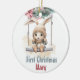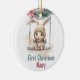 Elevem o vosso decoro de férias com a nossa personalizada Primeira Ornação de Natal do Bebê, apresentando um belo coelho balançante em tons confortáveis de inverno. Adicione uma reviravolta pessoal ao seu ambiente de férias. O ornamento da menina. Personalize com o nome do bebê e o ano, do outro lado você pode colocar uma foto do bebê, e mudar tudo como quiser
