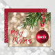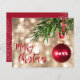 Um pequeno cartão de saudação plano de 4,5" x 5,6" apresenta um ornamento vermelho de árvore de Natal contra luzes desfocadas douradas e as palavras Feliz Natal na frente, e seu cartões de natal pessoal e nomes no verso. Estas placas de saudação de barato são impressas em papel de 110 lb, disponível em 3 tamanhos. **ENVELOPES BRANCOS SÃO OPCIONAIS NA PÁGINA ENCOMENDA. Certifique-se de verificar seu pedido duas vezes antes de adicioná-lo ao seu carrinho, pois o que você vê na tela é o que será impresso. O Serviço de Design ao Vivo pode ajudá-lo com seu layout de design, se necessário.