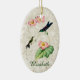 O Ornament apresenta uma ilustração antiga do Thornbill hummingbird roxo. Um beija-flor adulto com um dorso roxo escuro e garganta verde-metálica, e um filhote de pássaro com prega de garganta com flores cor-de-rosa, com um fundo de textura dourada-clara. Opções de personalização na frente e atrás, ou remover texto para uma elegante adição inspirada na natureza a qualquer árvore de Natal. Perfeito presente para amantes de beija-flor.
