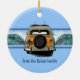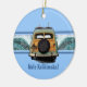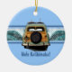 Uma vintage lenhosa equipada com um par de palangreiros encontra a onda perfeita de ruptura dupla. A onda ilustrada tem uma imagem fantasma de um hibiscus pareau impressão. A vintage placa da Califórnia diz Beachin. Para o Natal, a nossa saudação é "Mele Kalikimaka", mas estes ornamentos fazem presentes de excelente durante o ano, personalizam-nos com a vossa própria mensagem! Estas designs vêm de várias maneiras.