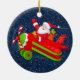 Papais noeis de Natal bonitos voando num avião com cheio de presentes e a hélice tem ornamento de listras vermelhas e brancas.