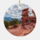 Souvenir do Ornamento do Colorado com uma explosão solar do sol brilha nos Gêmeos Siameses no Jardim dos Deuses com vista ao Pico das Montanhas Rochosas e Pikes ao fundo. O Jardim dos Deuses é um Landmark Natural Nacional em Primaveras do Colorado, Colorado. Procurando mais produtos? Visite minha loja: http://www.zazzle.com/timelessmomentsphtgy Foto tirada por Jennifer White com Fotografia Moments Eterno. Todas as imagens são protegidas por direitos autorais.