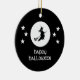 Faça um feitiço com este encantador, mas simples Ornamento do Dia das Bruxas, apresentando uma lua de cheio e estrelas atrás de uma bruxa voadora. Este ornamento divertido do Dia das Bruxas seria um item mágico de decoração ou guarda. Fácil de personalizar, basta adicionar seu próprio texto nos campos fornecidos. As fontes e as cores do texto podem ser alteradas clicando-se no botão "Personalizar".