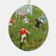 Um fósforo de futebol compo dos jogadores plásticos do futebol/futebol que incluem o árbitro e o depositário do objetivo na grama