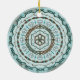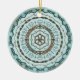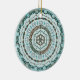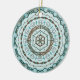 Esta mandala concêntrica apresenta camadas de padrões brancos, turquesas e marrons inspiradas por tecas celtas e capim indiano, como vinhas, fitas e flores de lótus.