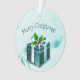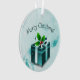 Adicione um toque balbucioso à sua árvore de Natal com um Ornamento de Presente de Natal Teal. Design de ornamento apresenta um presente de Natal cheio de felicidade adornado com bagas ocas e flocos de neve caindo contra um elegante pergaminho e folhas de fundo. Itens adicionais de presentes e feriados disponíveis com este design também.