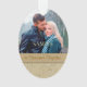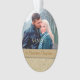 Este ornamento de manutenção de feriado apresenta sua própria fotografia, com uma borda de ouro elegante e espiral floral. Uma faixa de ouro mais escura mantém o seu texto personalizado; faça-o dizer o que você quiser! O verso do ornamento tem o mesmo padrão espiral floral dourado, com texto personalizado adicional na faixa dourada. Isto faz um belo presente de guardas para recém-casados ou qualquer casal. *Dica para colocar a sua fotografia — depois de carregar a sua fotografia, utilize "Personalizar" e as teclas de seta para a mover para obter a melhor aparência.*