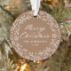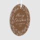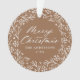 Elegante ornamento de fotos de feriado com "Feliz Natal" exibido em um roteiro de caligrafia branca cercado por uma coroa de flocos de neve e galhos de pinheiro em um fundo de cor de pão-de-gengibre. Personalize a frente do ornamento adicionando seu nome de família e o ano. A parte de trás do ornamento apresenta o seu fazer de fotos da família favorita, o que é perfeito para dar aos amigos e à família.