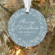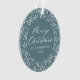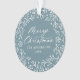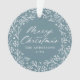 Elegante ornamento de fotos de feriado com "Feliz Natal" exibido em um roteiro de caligrafia branca cercado por uma coroa de flocos de neve e galhos de pinheiro em um fundo azul fosco. Personalize a frente do ornamento adicionando seu nome de família e o ano. A parte de trás do ornamento apresenta o seu fazer de fotos da família favorita, o que é perfeito para dar aos amigos e à família.