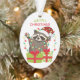 Este é um Enfeites de natal bonito para pais ou avós darem a uma criança, mas pode ser facilmente personalizado como presente para qualquer um. A frente do ornamento tem uma imagem de um desenho engraçado vestindo um chapéu de Papai Noel e segurando uma corda de luzes coloridas. Alguns pacotes de presentes brilhantes estão à sua frente, e o texto verde e vermelho diz "MERRY CHRISTMAS". A parte de trás do ornamento tem seu texto personalizado que é separado por uma pequena cana doce e buquê holly. Mude o texto facilmente para o que quiser!