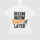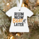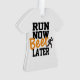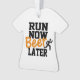 Enfeite engraçado diz em letras pretas e marrons "Run Now Beer Later". As costas podem ser mudadas para seu nome e ano ou o que quiser. Que presente de excelente para o corredor da sua vida! Ponha um SMILE nos rostos!