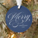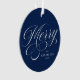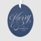 Enfeites de natal elegante com "Feliz" na frente em uma cobertura de script de caligrafia branca com fundo azul escuro. Personalize a frente do ornamento, acrescentando o seu nome e o ano em caracteres brancos. A parte de trás do ornamento mostra sua foto.