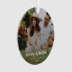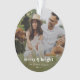 Um ornamento de fotos de feriado moderno com na moda, com uma poderosa tipografia retrógrada, que diz "feliz e brilhante" em branco. A saudação, o nome e o ano podem ser facilmente personalizados para um toque pessoal. Uma design moderna, minimalista e contemporânea para se destacar nesta temporada de férias! A imagem mostrada é apenas para fins de ilustração para ser substituída pela sua própria foto. A imagem do espaço é de um casal feliz tendo um piquenique com seu cachorro em um campo.