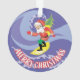 Este ornamento de árvore de Natal em acrílico mostra Papai Noel surfando nas ondas do oceano e a legenda "Feliz Natal".