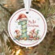 Celebrate a joyful milestone with this whimsical “My 1st Christmas” ornament featuring a large number one wrapped in glowing Christmas lights and topped with a cheerful Santa hat. The hat has baby's name on it. Three playful elves dressed in holiday attire sit nestled in snowy surroundings, surrounded by colorful ornaments, pine sprigs, and delicate snowflakes. The design is enclosed within a circular frame with a vibrant red border, adding a classic holiday touch.