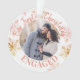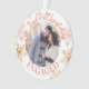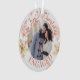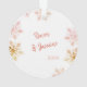 Nosso primeiro ornamento de fotos personalizado em inglês com flocos de neve e uma paleta colorida de ouro, pincel, pêssego e terracota. O modelo de foto é configurado para que você adicione uma de suas fotos favoritas e você também pode adicionar seus nomes e o ano no verso.