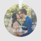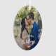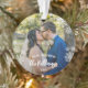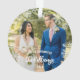 Floco de neve temeu o primeiro Natal como ornamento casado com seu sobrenome em um encantador roteiro de pincel, personalizado com suas fotos de casamento. Primeiro Natal como ornamento casado para recém-casados personalizados com uma foto de cada lado, seu sobrenome em uma cobertura de script de pincel branco junto com muitos flocos de neve bonito.