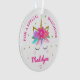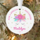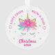 Esse ornamento personalizado de unicórnio filha apresenta um design de rosto de unicórnio fofo com flores e estrelas de brilho dourado. Personalize o texto na frente e atrás.