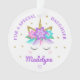 Esse ornamento personalizado de unicórnio filha apresenta um design de rosto de unicórnio fofo com flores e estrelas de brilho dourado. Personalize o texto na frente e atrás.