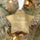Caligrafia de rico Feliz Natal em forma de estrela acrílica. Garota, brilha em ouro cintilante nos bordos superior e inferior sobre uma folha metálica em forma de metal esfregada em ouro. A cor do gráfico de texto antigo pode ser alterada. Você pode apagar o gráfico da tipografia e usar um lindo roteiro de caligrafia moderno do sistema para criar seu próprio ornamento personalizado.