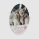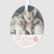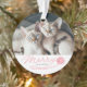 Os enfeites de natal bonitos para os proprietários do gato que caracterizam sua foto feita sob encomenda do animal de estimação com uma mão vermelha rotularam o roteiro que diz a "feliz" com uma corda que sai de uma bola do fio. Personalize este produto adicionando o nome do seu gato.