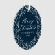 Elegante ornamento de fotos de feriado com "Feliz Natal" exibido em um roteiro de caligrafia branca cercado por uma coroa de flocos de neve e galhos de pinheiro em fundo de marinho. Personalize a frente do ornamento adicionando seu nome de família e o ano. A parte de trás do ornamento apresenta o seu fazer de fotos da família favorita, o que é perfeito para dar aos amigos e à família.