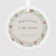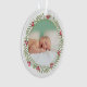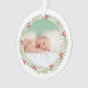 Este elegante ornamento de manutenção de fotos de dois lados apresenta uma foto de recém-nascido do seu bebê enquadrado por uma coroa verde floral de Natal.