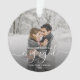 Comemore o seu noivado com este belo ornamento moderno do keepsasaame. O texto branco lê "Nosso primeiro Natal engajado", com a palavra "engajado" em uma escrita elegante com elogios antes e depois. Substitua a imagem de exemplo por sua foto favorita e adicione seus nomes e o ano. Um filtro de gradiente escuro ajuda a tornar o texto pop.