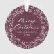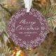 Elegante ornamento de fotos de feriado com "Feliz Natal" exibido em um roteiro de caligrafia branca cercado por uma coroa de flocos de neve e galhos de pinheiro em fundo roxo de morango. Personalize a frente do ornamento adicionando seu nome de família e o ano. A parte de trás do ornamento apresenta o seu fazer de fotos da família favorita, o que é perfeito para dar aos amigos e à família.