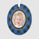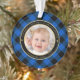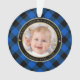 Este adorável Enfeites de natal temático rústico para novos avós mostra uma foto de bebê na frente, junto com um quadro circular dourado e preto sobre um fundo de xadrez de búfalo azul e preto. As palavras na falsa tipografia dourada leem " Ignacio Our First Christmas As Avós - Fantasmas - Brasil" com o nome e o ano abaixo do seu neto para personalizar. Faz um presente único para os avós. Desenhado pela artista ©Susan Coffey.