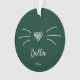 Enfeite de gato verde personalizado fofo. Um lado tem bigodes de gato fofo e o nome do gato em letra cursiva. O verso tem sua foto favorita do seu gato.