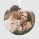 Enfeites de natal elegante com "Feliz" na frente, em uma cobertura de script de caligrafia branca com fundo vermelho. Personalize a frente do ornamento, acrescentando o seu nome e o ano em caracteres brancos. A parte de trás do ornamento mostra sua foto.