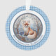 Este encantador ornamento mostra uma ilustração de uma raposa laranja e branca contra uma floresta vitícola azul e branca. Está bordado em castanho e azul, com uma saudação personalizada, e um fundo azul fresco de gingham. Digite o texto desejado na caixa Personalizar. As cores únicas e o estilo encantador deste ornamento de raposa adicionarão um toque exclusivo à sua árvore de Natal ou decoração doméstica.