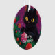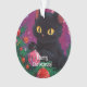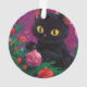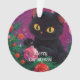 Este gatinho preto muito bonito, muito intrigado com as bolas coloridas balançando da Árvore de Natal.