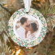 Este maravilhoso ornamento de manutenção de férias de recém-casados apresenta uma exuberante e festiva coroa de folhas de ouro, verde de Natal e bagas brancas vermelhas num fundo branco moderno. Sua foto de casamento pessoal vai ao centro junto com as palavras "Casado e Feliz", e há até um lugar para seu nome. Uma segunda foto vai para o fundo. Um presente perfeito para o marido e a esposa recém-casados.