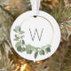 Estes enfeites de natal modernos são uma lembrança especial da família para os newlyweds. Personalize as áreas da foto e do monograma do casamento. Decorado com uma grinalda da folha verde minimalista e da flor branca.