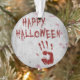 Uma ilustração horrível e assustadora do Dia das Bruxas, com uma impressão de mão sangrenta e uma espadilha de sangue num fundo gelado.