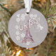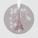 Este ornamento acrílico redondo é uma cor de cinza com uma ilustração em vermelho da Torre Eiffel, na França, cercada por margaridas brancas com o texto Oh Paris. Personalize o texto no verso com o modelo.