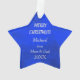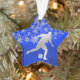 Para a estrela de futebol em sua vida, este Enfeites de natal apresenta um jogador de futebol prateado em frente a um spray de flocos de neve prateada. A imagem é colocada sobre um fundo azul brilhante de abstrato. A parte traseira do ornamento tem o mesmo plano de fundo azul com campos de texto que você pode personalizar. Perfeito para o jogador de futebol ou fã, e também faz um excelente de guarda de crianças de pais ou avós.