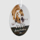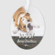 Rústica Madeira Feliz Cachorro de Natal Puppy Pet Ornament. O design tem um fundo de madeira escura rústico com flocos de neve brancos e texto branco. Você pode usar este ornamento personalizado para qualquer animal de estimação. Um doce bem-estar.