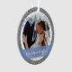 Esplêndido mas elegante "Marrily ever After" (que você pode mudar para "Merrily ever ever After" se quiser) Nosso Primeiro Natal como Sr. e Sra. [Nome da Família] Enfeites de natal personalizado de fotos para recém-casados, com tipografia cursiva moderna / cartazes manuais em banda-semitransparente azul, um quadro de flocos de neve brancos e prateados e estrelas pequenas, e outro quadro de brilho prateado simulado. Assegure-se de personalizar pelo menos as duas fotos (frente e verso), o nome da família na frente, os primeiros nomes e o ano no verso.