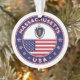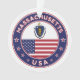 Crachá de Massachusetts com bandeira de Massachusetts e bandeira dos EUA, cores, forma arredondada. Emblema de Massachusetts. Selo de Massachusetts. Coleção dos Estados Unidos.