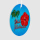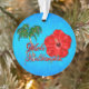 Mele Kalikimaka é havaiano para o Feliz Natal. Comemore um Natal morno agradável da praia. Mele Kalikimaka decorado com enfeites de natal e bastões de doces. Um Natal decorou a palmeira e um hibiscus vermelho do feriado floresce.
