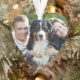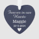 O ornamento memorial em forma de coração, simplesmente elegante, pode ser personalizado como um guardião especial para a perda de um cão de estimação, gato ou outro amado. Design apresenta uma foto na frente e personalizada 'Forever in our Hearts' com seu nome e expectativa de vida na parte de trás. Os estilos de cor azul e fonte da meia-noite podem ser modificados.