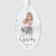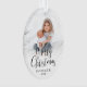 Celebrar as simples alegrias das férias com um feliz Natal, com dois ornamentos ovais fotoacrílicos. As imagens e todos os textos neste modelo são fáceis de personalizar e podem ser diferentes ou iguais em frente e atrás. O moderno design preto e branco minimalista apresenta caligrafia de script moderno, tipografia clássica elegante e duas fotos de sua escolha. Esta única vitória de feriado adiciona um toque de na moda às decorações das casas de Natal. Feliz Natal!