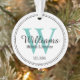 Monograma Personalizado Novo Enfeites de natal de Acrílico Verde Teal Milho. A fronteira pontilhada lembra os grãos de milho, que é uma técnica de detalhamento de joias muitas vezes usada para noivados e anéis de casamento. A fronteira milgral acrescenta um estilo moderno e elegante a este ornamento.
