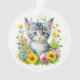 Enfeites de natal personalizado. Ai art retratando um gatinho de cinza listrado, gatinho de gato sentado num bando de flores bonito amarelas, rosa e azuis.